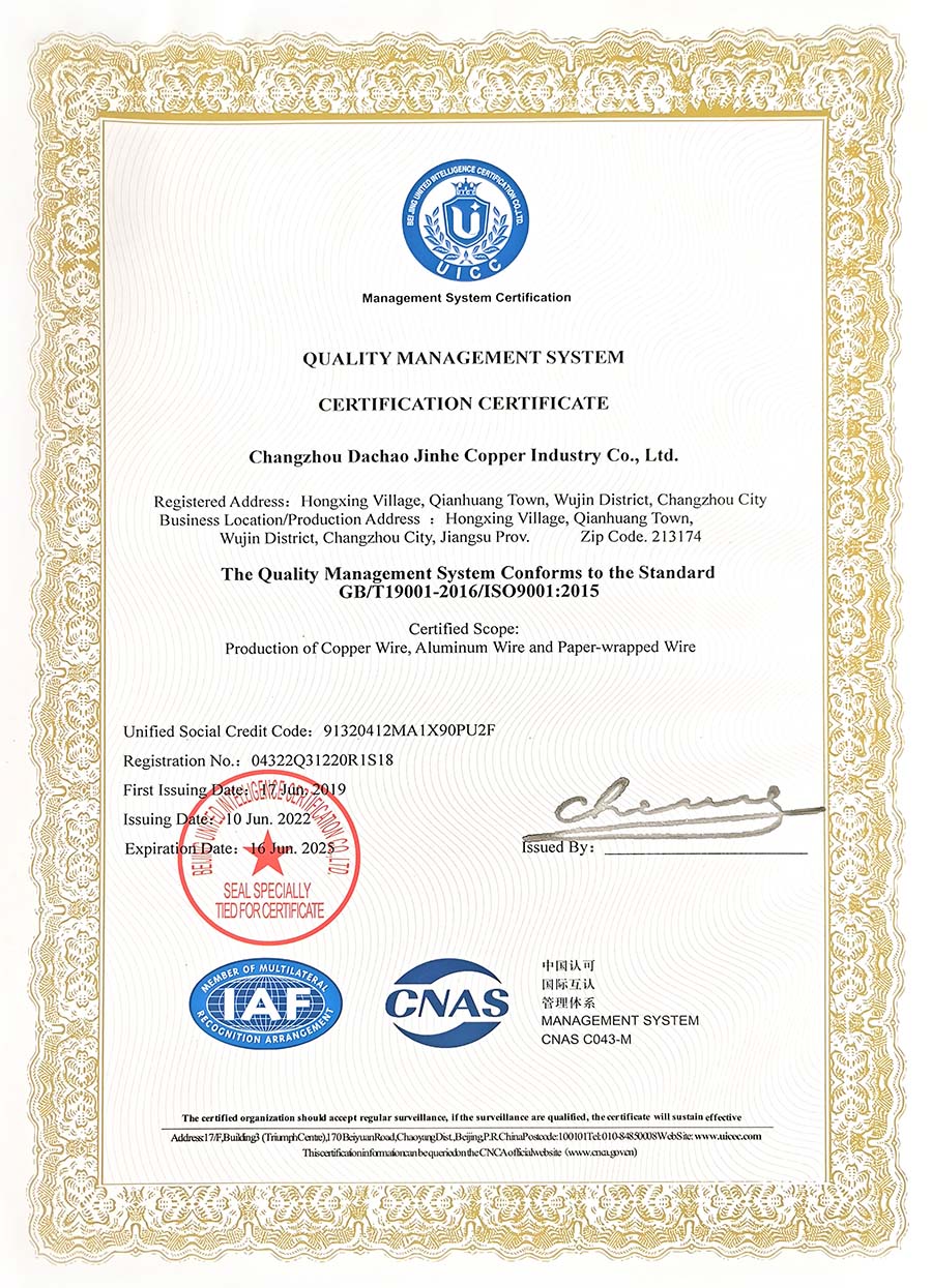 Changzhou Dachao Jinhe Copper Co., Ltd. is located in the Yangtze River Delta, adjacent to Taihu Lake, 250 kilometers away from Shanghai Hongqiao International Airport in the east, and 180 kilometers away from Hangzhou Xizi Lake in the west. The transportation is convenient and developed. The company specializes in the production and sales of bare copper (aluminum) flat wire, copper rod, copper bar, profiled copper bar (silver copper), enamelled round wire, enamelled flat wire, paper covered wire and silk covered wire. It is one of the manufacturers with manufacturing strength for special copper wire for transformers, automobile motors, DC motors and commutators in China...