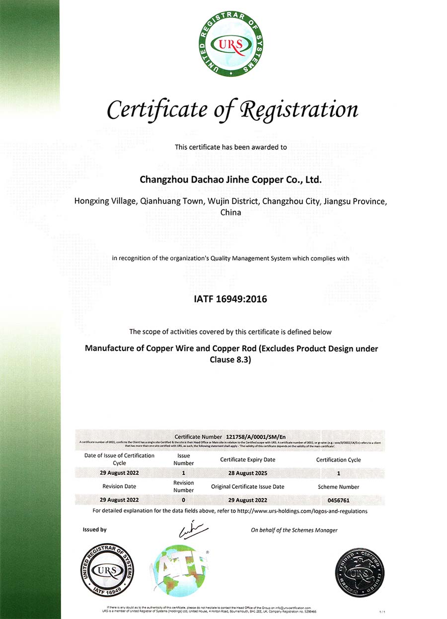 Changzhou Dachao Jinhe Copper Co., Ltd. is located in the Yangtze River Delta, adjacent to Taihu Lake, 250 kilometers away from Shanghai Hongqiao International Airport in the east, and 180 kilometers away from Hangzhou Xizi Lake in the west. The transportation is convenient and developed. The company specializes in the production and sales of bare copper (aluminum) flat wire, copper rod, copper bar, profiled copper bar (silver copper), enamelled round wire, enamelled flat wire, paper covered wire and silk covered wire. It is one of the manufacturers with manufacturing strength for special copper wire for transformers, automobile motors, DC motors and commutators in China...